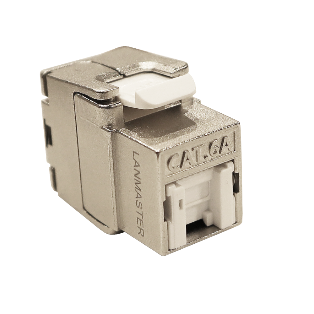 Модуль может использоваться для комплектации экранированных телекоммуникационных розеток, устанавливаемых в короб, на стену, в стену, а также для установки в наборные патч-панели (см. совместимые товары).Соответствует требованиям категории 6A.Модуль имеет стандартный типоразмер Keystone и может использоваться не только в розетках LANMASTER, но и в розетках других производителей.На лицевой стороне модуля смонтировано экранированное восьмиконтактное гнездо типа RJ-45, с обратной стороны установлен блок на восемь контактов типа IDC110, расположенных под углом 180° к лицевой поверхности модуля.Непрерывность экрана обеспечивается стягиванием половинок крышки.Для подключения кабелей используется способ врезного контакта сквозь изоляцию - IDC. Для удобства монтажа, на крышке модуля расположена схема подключения проводников кабеля, в соответствии со схемами T568A и T568B. Кабель раскладывается в пазы на крышке модуля, излишки обрезаются. При защелкивании половинок крышки корпуса, контакты прорезают изоляцию проводника. Таким образом, подключаемый кабель легко монтируется без использования инструмента. Модуль имеет встроенную шторку, автоматически утапливаемую при подключении к модулю патч-корда. Шторка защищает контакты модуля от попадания пыли, грязи и механических повреждений при использовании модуля в наборных панелях или с лицевыми вставками, не имеющими своих защитных шторок.
