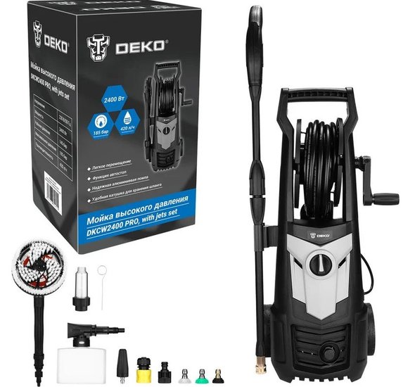 • Комплектация - Мойка - 1 шт- Ручка - 1 шт- Катушка для шланга (состоит из 2-х частей) - 1 шт- Ручка катушки - 1 шт- Боковые держатели катушки - 2 шт- Держатель шнура питания - 1 шт- Держатель емкости для моющего средства - 1 шт- Держатель пистолета - 2 шт- Высоконапорный пистолет - 1 шт- Распылительная трубка - 1 шт- Шланг высокого давления - 1 шт- Пеногенератор - 1 шт- Фильтр - 1 шт- Насадка-распылитель - 1 шт- Грязевая фреза- Насадка-щетка - 1 шт- Форсунки - 3 шт- Коннектор для подачи воды - 1 шт- Быстроразъемное соединение - 1 шт- Игла для прочистки распыляющего наконечника - 1 шт- Крепежный комплект - 1 шт- Руководство по эксплуатации - 1 шт