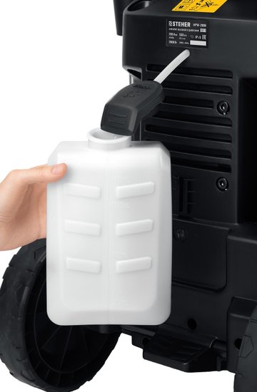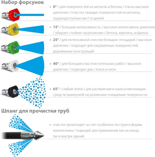 Комплектация- Мойка высокого давления;- Пистолет;- Распылитель;- Насадка 4;- Шланг высокого давления (8 м);- Фильтр;- Игла для прочистки;- Руководство по эксплуатации.