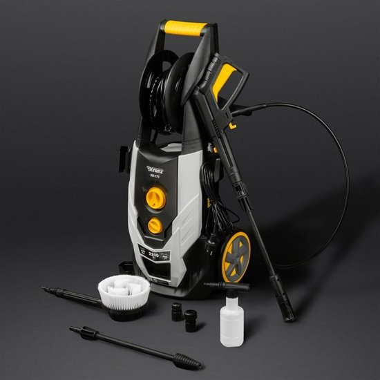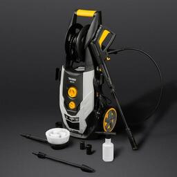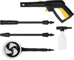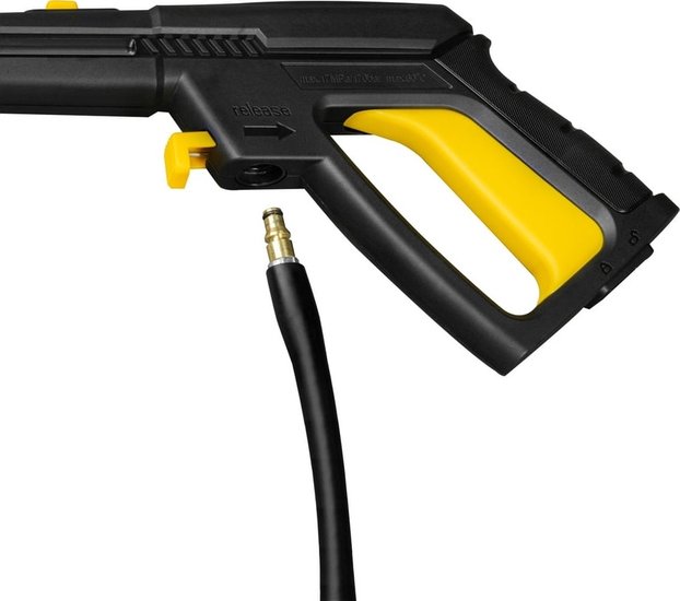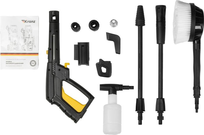 Комплектация- Мойка высокого давления;- Пистолет;- Шланг высокого давления;- Пеногенератор (дополнительная насадка на пистолет емкостью 500 мл);- Фильтр тонкой очистки;- Игла для прочистки форсунки;- Турбощетка;- Руководство по эксплуатации с гарантийным талоном;- Упаковка.