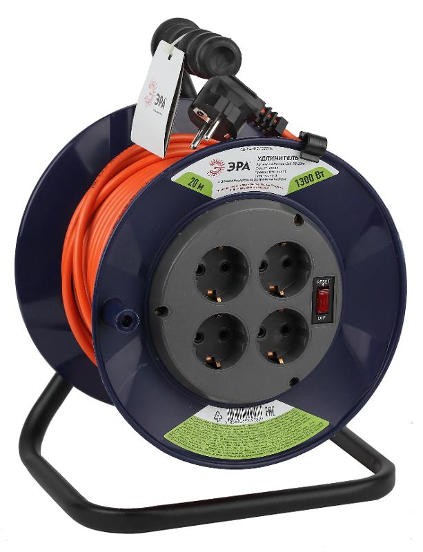 Удлинитель силовой на пластиковой катушке ЭРА RPx-4es-3х0.75-20m с заземлением, с выключателем, ПВС 3х0,75м2, 4 розетки, 20 м. Мощность 6А/1300Вт. Используется для работы на строительных площадках или дачных участках. Удобен при работе с приборами находящимися удаленно от стационарной розетки,. Например, газонокосилки, электрические, пилы, триммеры или электродрели. Провод в удлинителях Эра сделан из 100% меди, что делает его абсолютно пожаробезопасным. Рама удлинителя сделана из высокопрочной стали а пластиковой корпус выполнен с применением негорючих добавок.