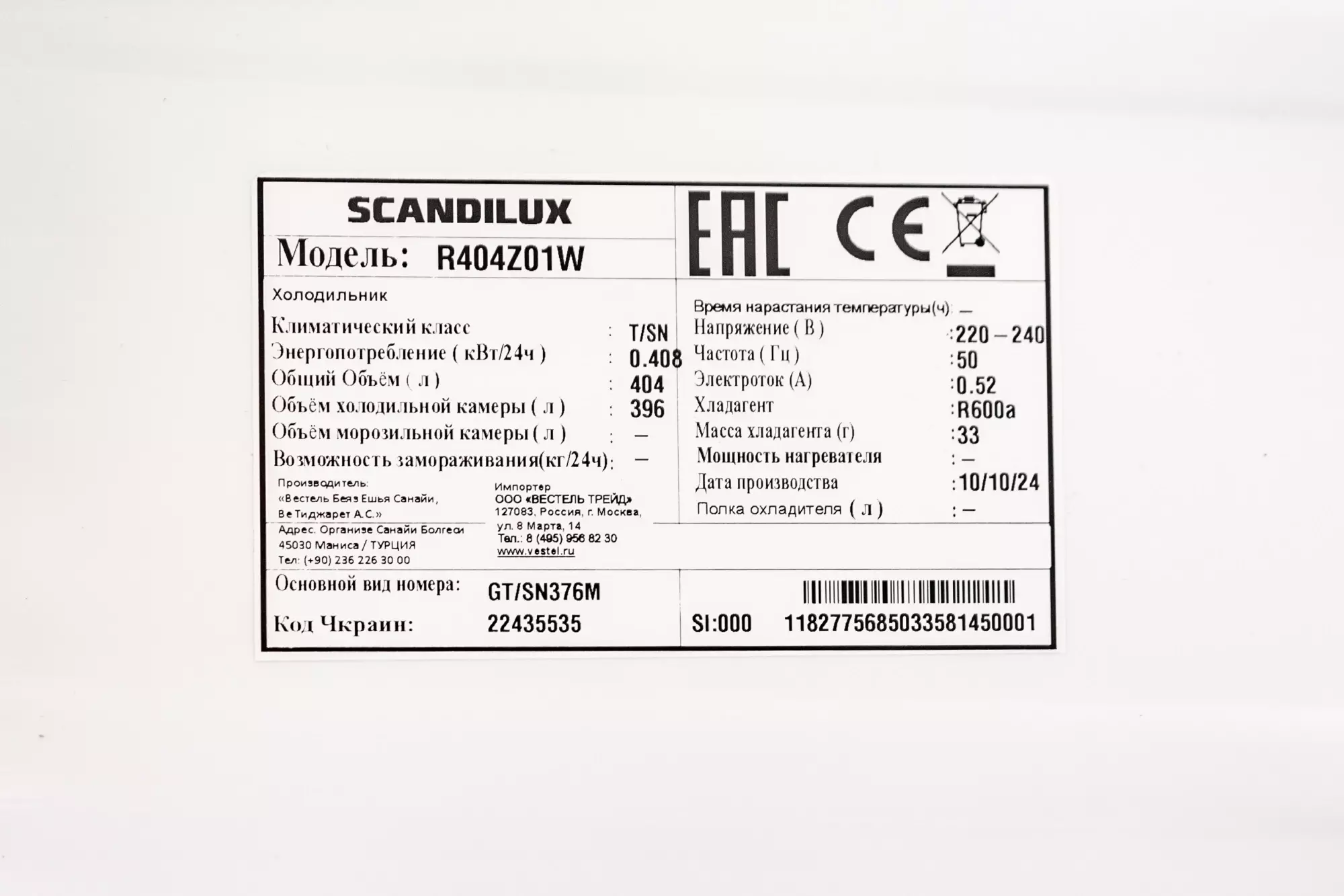 • Общий объем холодильной камеры 404 л