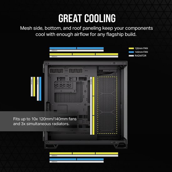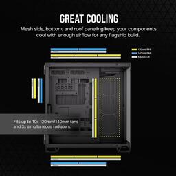 • Расположение вентиляторов сверху: 3x 120mm, 3x 140mmснизу: 3x 120mm, 3x 140mmсбоку: 3x 120mmсзади: 1x 120mm, 1x 140mm