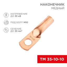 Наконечник ТМ 35-10-10 (35мм² - Ø10мм) REXANT предназначен для оконцевания опрессовкой медных кабелей и проводов. Выполнен из высококачественной меди.Структура обозначения:Т — Труба — полуфабрикат, из которого изготовлен наконечник М — Медь — материал, из которого изготовлен наконечник 35 — номинальное сечение наконечника, мм²10 — диаметр контактного стержня, мм10— внутренний диаметр хвостовика, мм