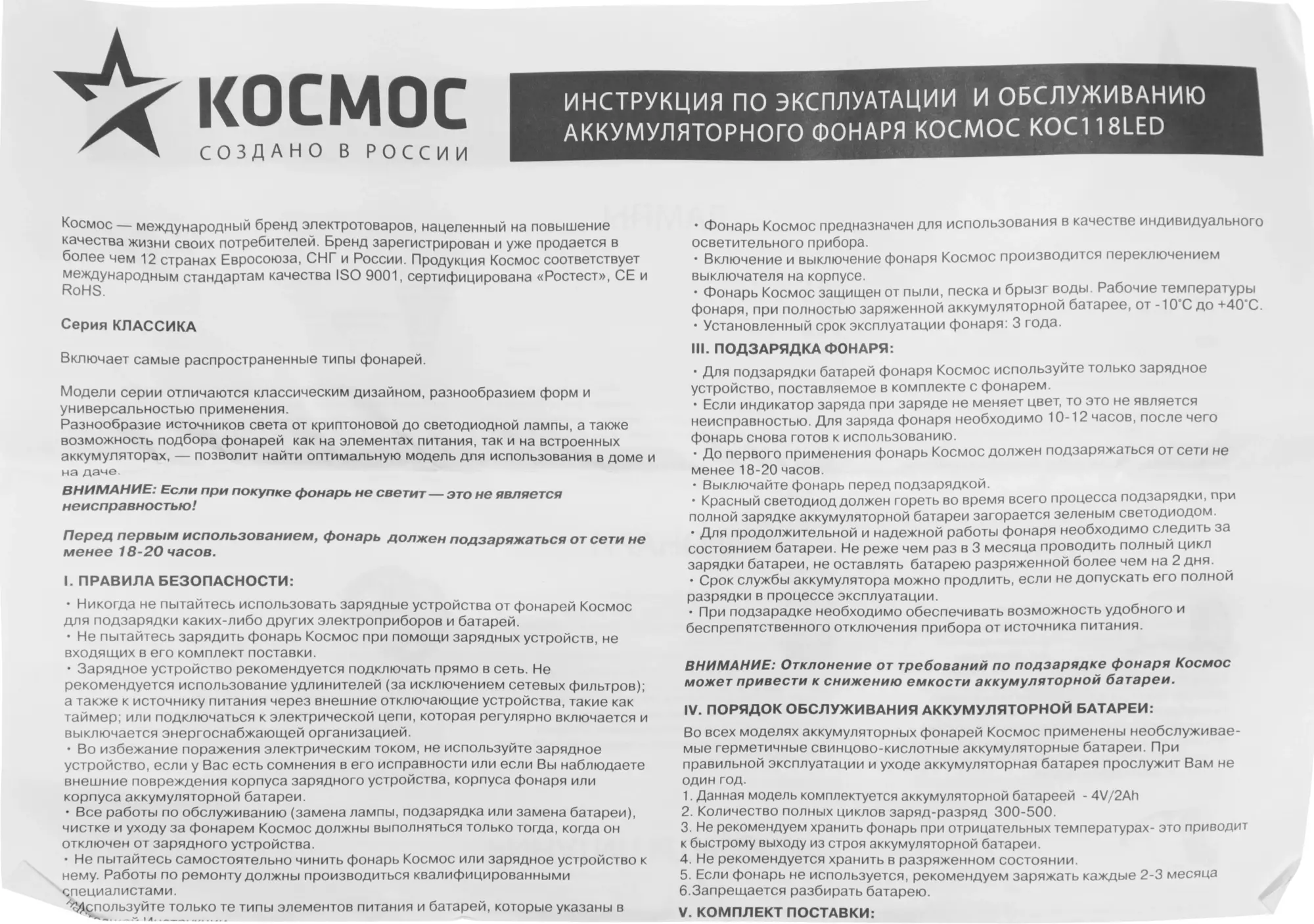 • Комплект поставки Фонарь, USB-кабель для зарядки.