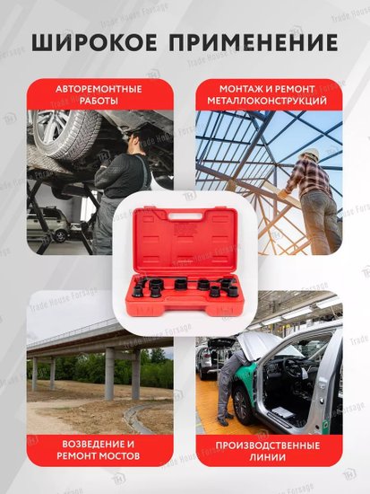 ✅ Набор из 10 предметов — идеальный выбор для профессионалов и любителей, которым нужны надежные инструменты для выполнения сложных задач. В комплект входят 8 ударных торцевых 6-гранных головок размером 3/4" (17, 19, 21, 22, 24, 27, 30, 32, 36 мм), Г-образный вороток и адаптер-переходник длиной 200 мм, все это удобно упаковано в прочный пластиковый кейс.✅ Прочность и надежность: головки изготовлены из высококачественной хроммолибденовой стали (Cr-Mo), что позволяет им выдерживать экстремальные крутящие моменты и гарантирует долговечность. Эти инструменты созданы для работы в самых тяжелых условиях, что делает их незаменимыми для автомобильного ремонта и промышленных работ.✅ Широкое применение: набор подходит для различных задач, включая строительные работы и техническое обслуживание, а также для ситуаций с ограниченным доступом и высоким уровнем нагрузки. Это делает его универсальным инструментом для любого мастера.✅ Удобство и мобильность: все инструменты упакованы в ударопрочный пластиковый кейс, который защищает их от повреждений и обеспечивает удобство хранения и транспортировки. Размеры кейса (39х24х9 см) позволяют компактно разместить его в вашем рабочем пространстве.✅ Разнообразие размеров: набор включает головки различных размеров, что поможет вам справиться с любыми задачами, связанными с ремонтом, техническим обслуживанием или монтажом. Этот комплект станет надежным помощником в вашем арсенале инструментов. ⚠️ Не упустите возможность улучшить свою работу с этим качественным набором!✅ Набор из 10 предметов — идеальный выбор для профессионалов и любителей, которым нужны надежные инструменты для выполнения сложных задач. В комплект входят 8 ударных торцевых 6-гранных головок размером 3/4" (17, 19, 21, 22, 24, 27, 30, 32, 36 мм), Г-образный вороток и адаптер-переходник длиной 200 мм, все это удобно упаковано в прочный пластиковый кейс.✅ Прочность и надежность: головки изготовлены из высококачественной хроммолибденовой стали (Cr-Mo), что позволяет им выдерживать экстремальные крутящие моменты и гарантирует долговечность. Эти инструменты созданы для работы в самых тяжелых условиях, что делает их незаменимыми для автомобильного ремонта и промышленных работ.✅ Широкое применение: набор подходит для различных задач, включая строительные работы и техническое обслуживание, а также для ситуаций с ограниченным доступом и высоким уровнем нагрузки. Это делает его универсальным инструментом для любого мастера.✅ Удобство и мобильность: все инструменты упакованы в ударопрочный пластиковый кейс, который защищает их от повреждений и обеспечивает удобство хранения и транспортировки. Размеры кейса (39х24х9 см) позволяют компактно разместить его в вашем рабочем пространстве.✅ Разнообразие размеров: набор включает головки различных размеров, что поможет вам справиться с любыми задачами, связанными с ремонтом, техническим обслуживанием или монтажом. Этот комплект станет надежным помощником в вашем арсенале инструментов. ⚠️ Не упустите возможность улучшить свою работу с этим качественным набором!
