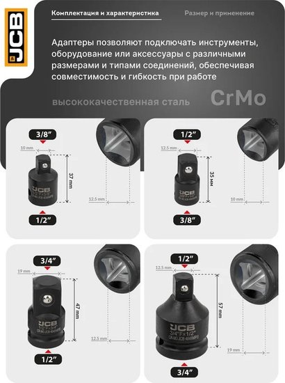 ❗️Текст описания составлен при помощи искусственного интеллекта.✅ Набор адаптеров слесарных JCB JCB-4048MPB — это идеальное решение для профессионалов и любителей, которые ценят качество и надежность в работе. Этот комплект включает 4 адаптера, которые помогут вам легко и быстро выполнять различные слесарные задачи.✅ Уникальная ударная конструкция адаптеров обеспечивает долговечность и высокую производительность. С присоединительными размерами 1/2", 3/4" и 3/8", вы сможете использовать их с различными инструментами, что делает набор универсальным и многофункциональным.✅ Ложемент в комплекте обеспечивает удобное хранение и транспортировку адаптеров, что особенно важно для тех, кто часто работает в полевых условиях. Вы всегда сможете найти нужный инструмент в нужный момент!⚠️ Обратите внимание, что данный набор идеально подходит для работы с дюймовыми системами измерения, что делает его незаменимым для слесарей и механиков. ✅ С набором JCB JCB-4048MPB вы получите надежные и качественные адаптеры, которые помогут вам справиться с любыми задачами. Не упустите возможность улучшить свой инструментальный арсенал!❗️Текст описания составлен при помощи искусственного интеллекта.✅ Набор адаптеров слесарных JCB JCB-4048MPB — это идеальное решение для профессионалов и любителей, которые ценят качество и надежность в работе. Этот комплект включает 4 адаптера, которые помогут вам легко и быстро выполнять различные слесарные задачи.✅ Уникальная ударная конструкция адаптеров обеспечивает долговечность и высокую производительность. С присоединительными размерами 1/2", 3/4" и 3/8", вы сможете использовать их с различными инструментами, что делает набор универсальным и многофункциональным.✅ Ложемент в комплекте обеспечивает удобное хранение и транспортировку адаптеров, что особенно важно для тех, кто часто работает в полевых условиях. Вы всегда сможете найти нужный инструмент в нужный момент!⚠️ Обратите внимание, что данный набор идеально подходит для работы с дюймовыми системами измерения, что делает его незаменимым для слесарей и механиков. ✅ С набором JCB JCB-4048MPB вы получите надежные и качественные адаптеры, которые помогут вам справиться с любыми задачами. Не упустите возможность улучшить свой инструментальный арсенал!
