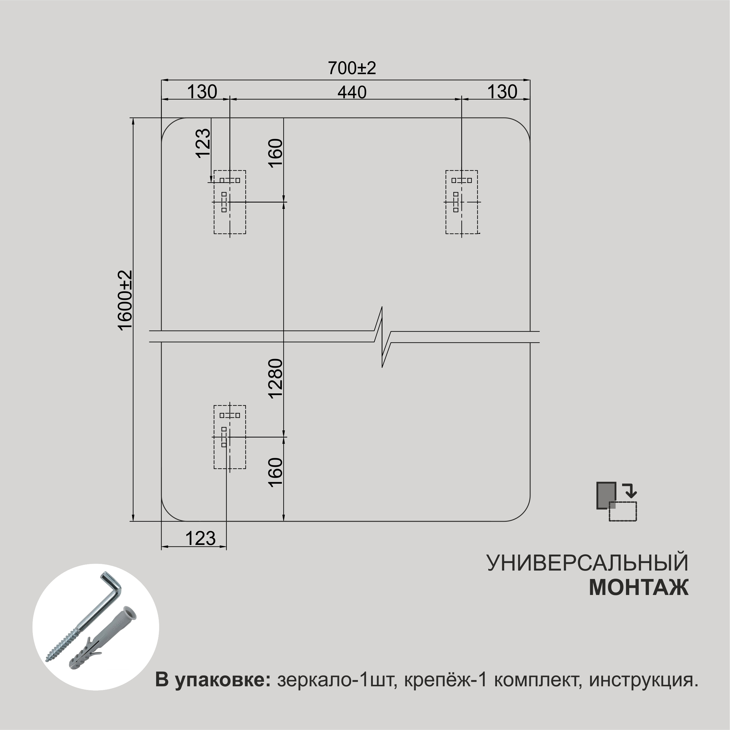 • Форма зеркала прямоугольная (с закругленными краями)