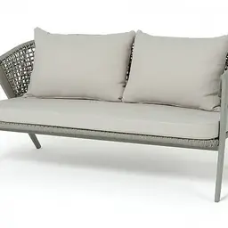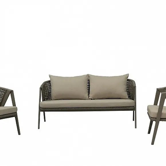 - два кресла 640×770×735 мм. Диван и кресла изготовлены из алюминиевого каркаса, оплетенного вручную эластичными синтетическими лентами из высокопрочных полиэфирных волокон.
