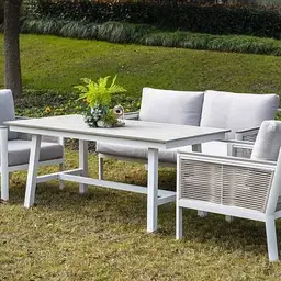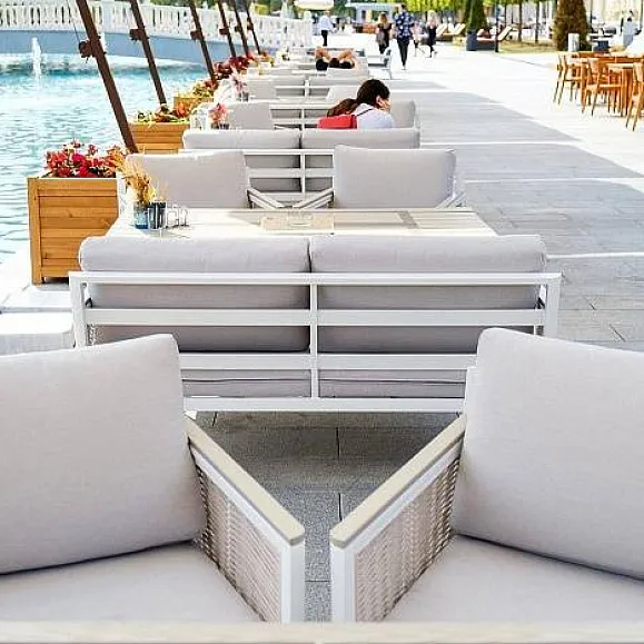 «Сан Ремо» лаунж-зона, алюминиевый каркас белого цвета, вручную оплетенный роупом серо-коричневого цвета.