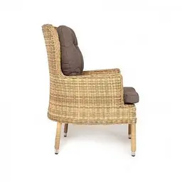 Каркас выполнен из высококачественного алюминия, который оплетен круглым искусственным ротангом соломенного цвета. В садовое кресло укомплектовывается мягкими подушками.