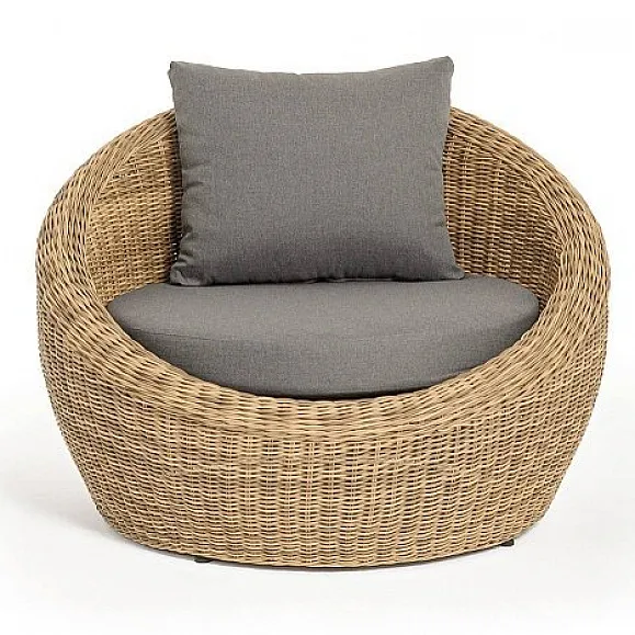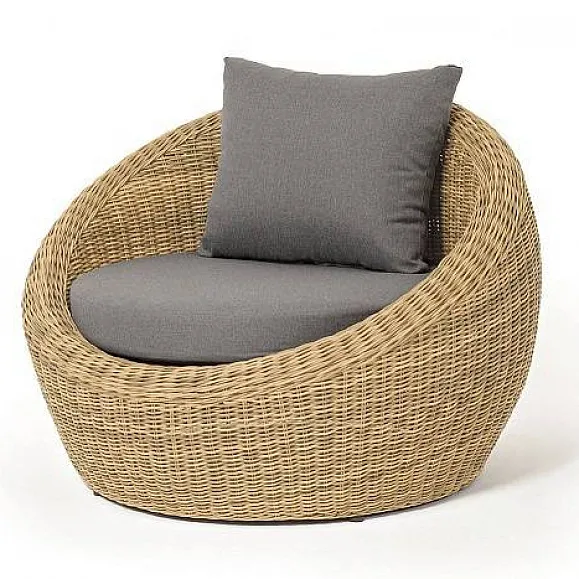 Представлена модель в соломенном цвете. В комплекте с уличным ротанговым креслом идут мягкие подушки со съёмными чехлами серо-коричневого оттенка.