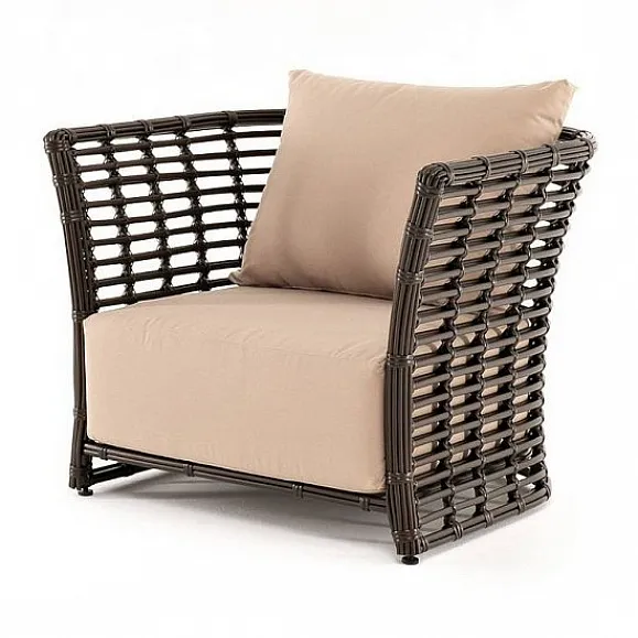 Кресло оснащено каркасом из прочного алюминия, ручное круглое плетение является основным декоративным элементом мебели.