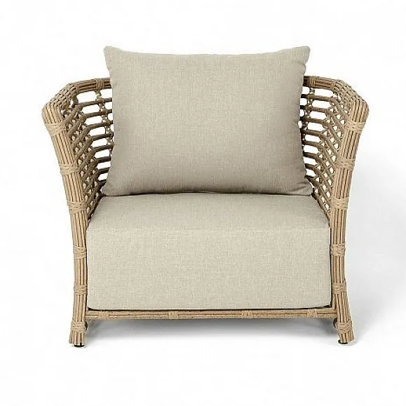 Кресло оснащено каркасом из прочного алюминия, ручное круглое плетение является основным декоративным элементом мебели.