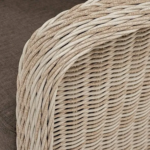 Кресло оснащено каркасом из прочного алюминия, а его оплетка выполнена из круглого ротанга ручного плетения бежевом цвета.