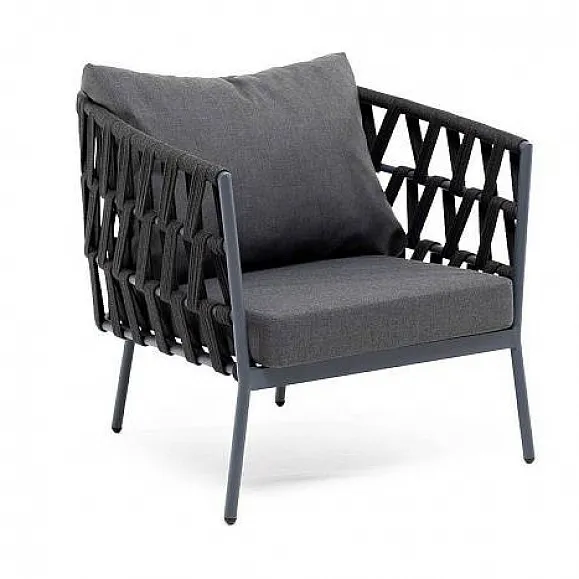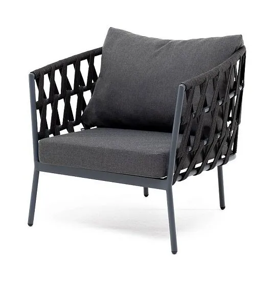 Кресло Диего 4SIS плетеное из роупа, каркас алюминий темно-серый (RAL7024) муар, роуп темно-серый круглый, ткань темно-серая 27