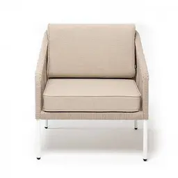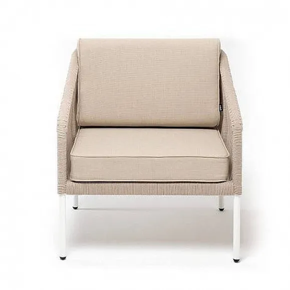 Кресло Канны 4SIS плетеное из роупа, каркас алюминий белый муар, роуп бежевый круглый, ткань бежевая 52