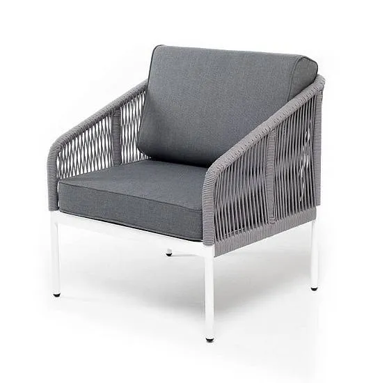 Кресло Канны 4SIS плетеное из роупа, каркас алюминий белый муар, роуп светло-серый круглый, ткань серая 17