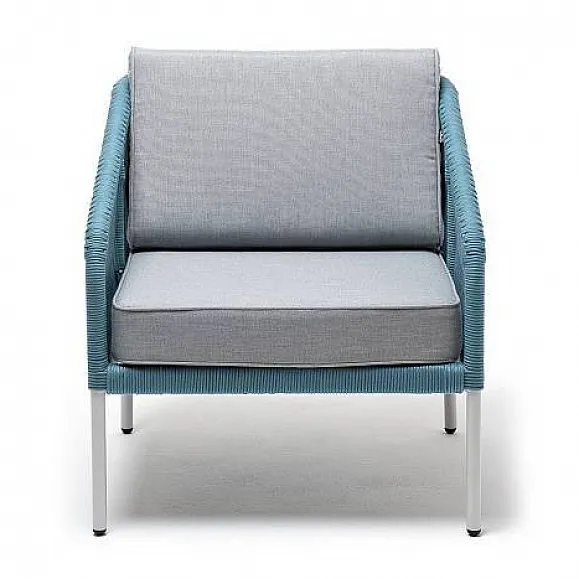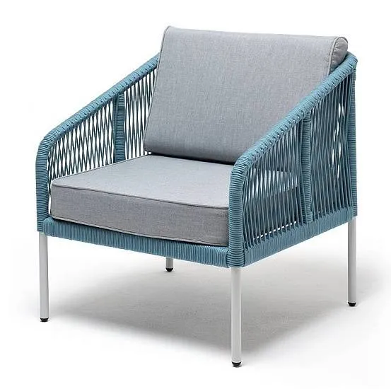 Кресло Канны 4SIS плетеное из роупа, каркас алюминий светло-серый (RAL7035) муар, роуп бирюзовый круглый, ткань светло-серая