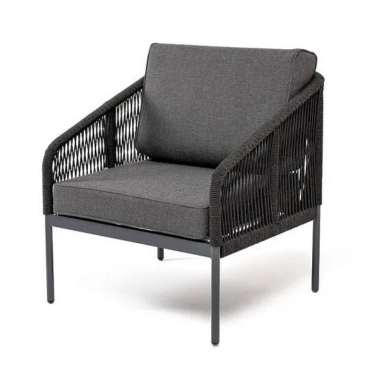 Кресло Канны 4SIS плетеное из роупа, каркас алюминий темно-серый (RAL7024) муар, роуп темно-серый круглый, ткань темно-серая 27 высота посадки 45 см