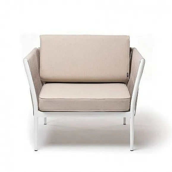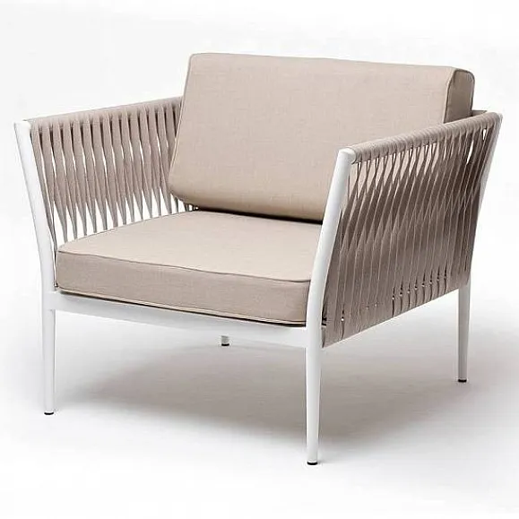 Кресло Касабланка 4SIS плетеное из роупа, каркас алюминий белый муар, роуп бежевый 20мм, ткань бежевая 52