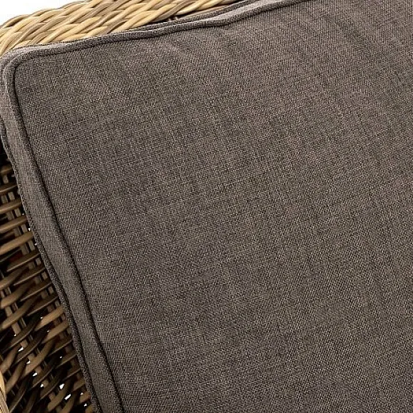 В комплекте с уличным ротанговым креслом идут мягкие подушки со съёмными чехлами серо-коричневого оттенка. Они пошиты из полиэстера, который не боится повышенной влажности благодаря наличию влагоотталкивающей пропитки.