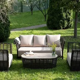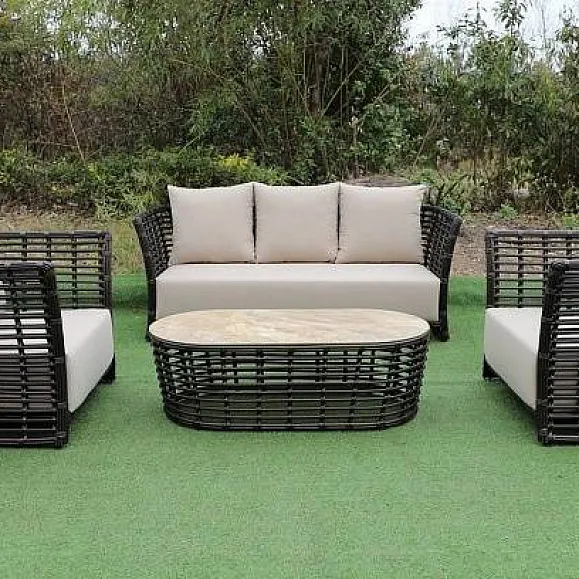 Плетеная мебель дополнена удобными подушками в бежевых чехлах. При их изготовлении используют полиэстер, плотность – 300гр/м2.