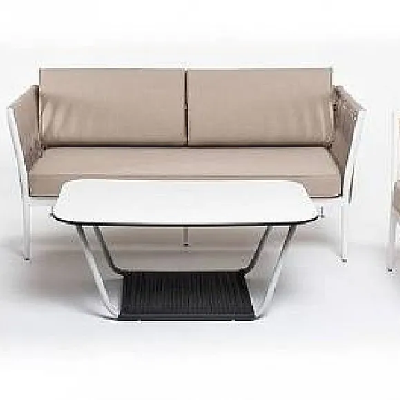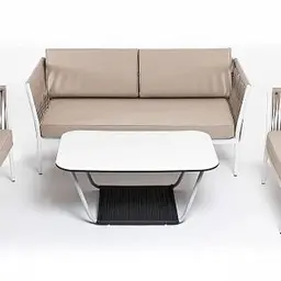 Диван и кресла изготовлены их алюминиевого прочного каркаса, оплетенного ручным способом роупом бежевого цвета. Это эластичные ленты из полиэфирных волокон высокого качества.