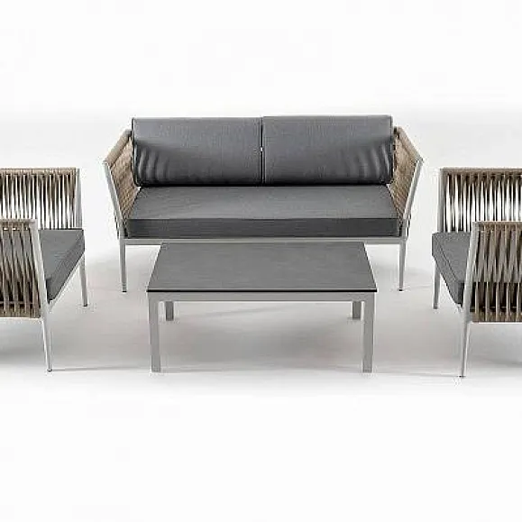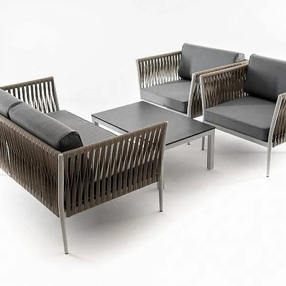 Диван и кресла изготовлены их алюминиевого прочного каркаса, оплетенного ручным способом роупом серо-коричневого цвета. Это эластичные ленты из полиэфирных волокон высокого качества.