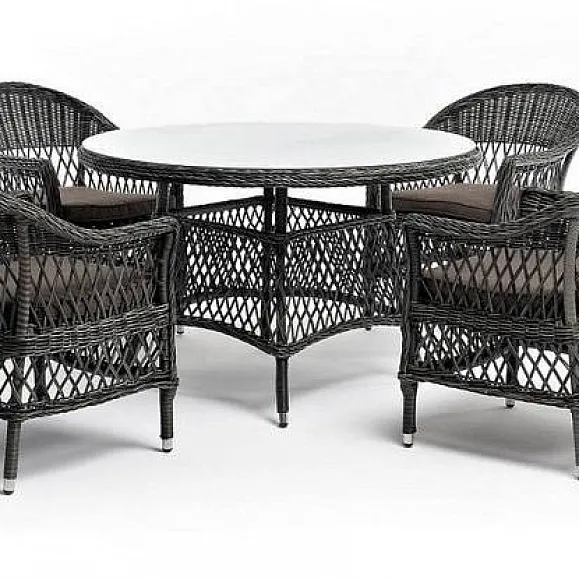 Столешница изготовлена из прочного закаленного стекла 5 мм, кресла укомплектованы подушками серо-коричневого цвета со съёмными чехлами. .