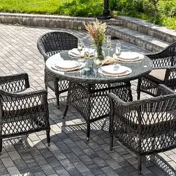Вся мебель изготовлена из алюминия, поэтому ее очень легко перемещать. Декоративное покрытие выполнено из долговечного искусственного ротанга, устойчивого к перепадам температур и переменам погоды.