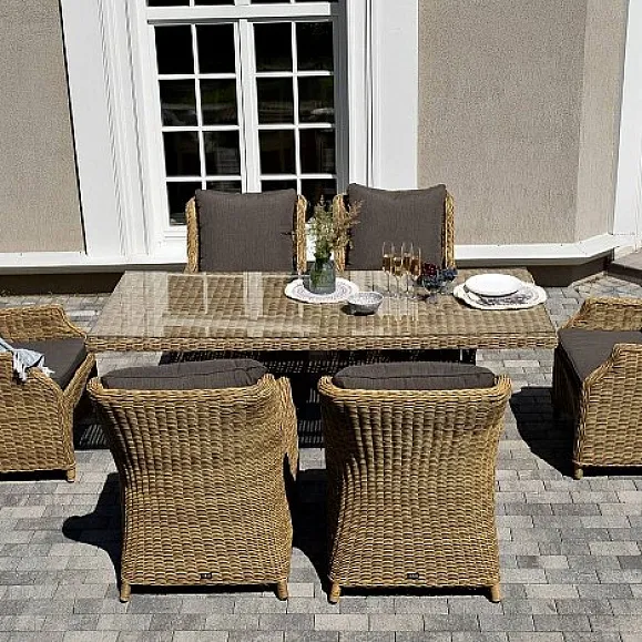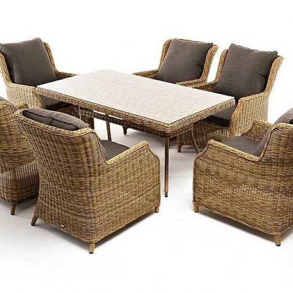 Каркас всех изделий выполнен из легкого и долговечного алюминия, оплетенного вручную круглым искусственным ротангом натурального соломенного цвета. Столешница укомплектована ударопрочным стеклом, толщиной 5 мм.
