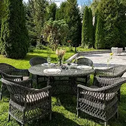 Цвет - графит. Вся мебель изготовлена из долговечного и легкого алюминия, обтянутого синтетическим ротангом.