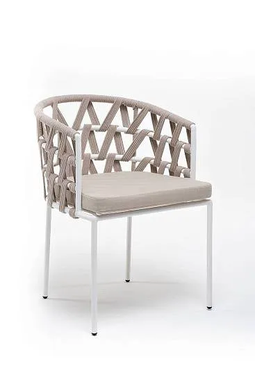 Стул Диего 4SIS плетеный из роупа, каркас из стали белый муар, роуп бежевый круглый, ткань бежевая 52