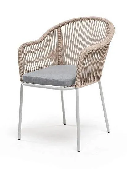 Стул Лион 4SIS плетеный из роупа, каркас из стали светло-серый (RAL7035) муар, роуп бежевый круглый, ткань светло-серая