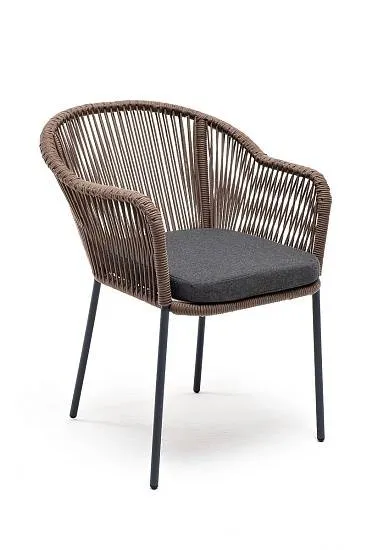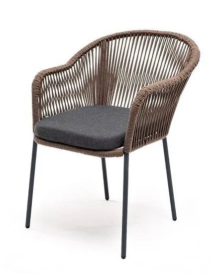 Стальной каркас серого (RAL7022) цвета гарантирует прочность и надежность, а плетение из эластичных лент высокопрочных полиэфирных волокон коричневого оттенка создает удобное и уютное сидение. Подушка в комплекте со стулом выполнена из полиэстера 100% плотностью 300гр/м2 с влагоотталкивающей пропиткой темно-серого цвета.