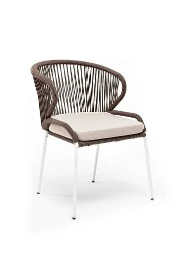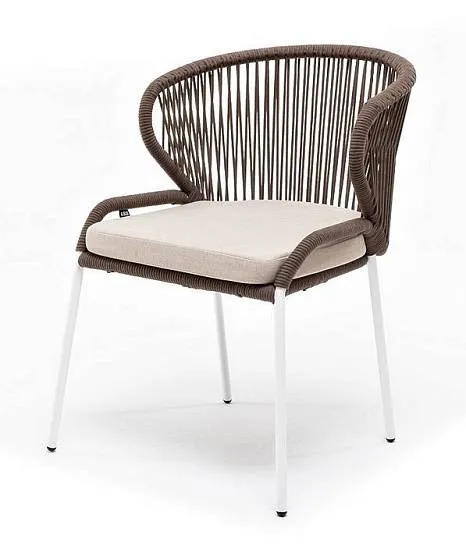 Стул Милан 4SIS плетеный из роупа, каркас алюминий белый муар, роуп коричневый круглый, ткань бежевая 52