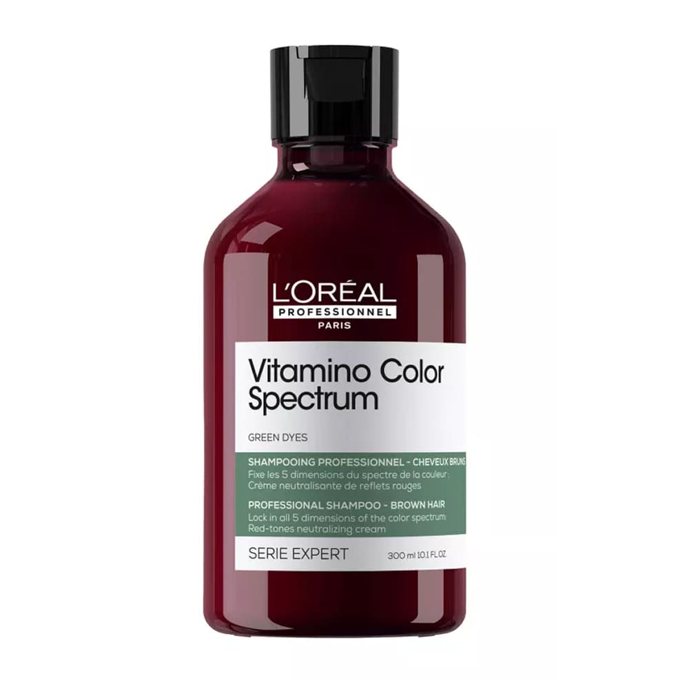 Зеленый шампунь Vitamino Color Spectrum — ваш личный колорист, который бережно устраняет нежелательные красные оттенки, возвращая каштановым и черным волосам глубину и холодное сияние.
