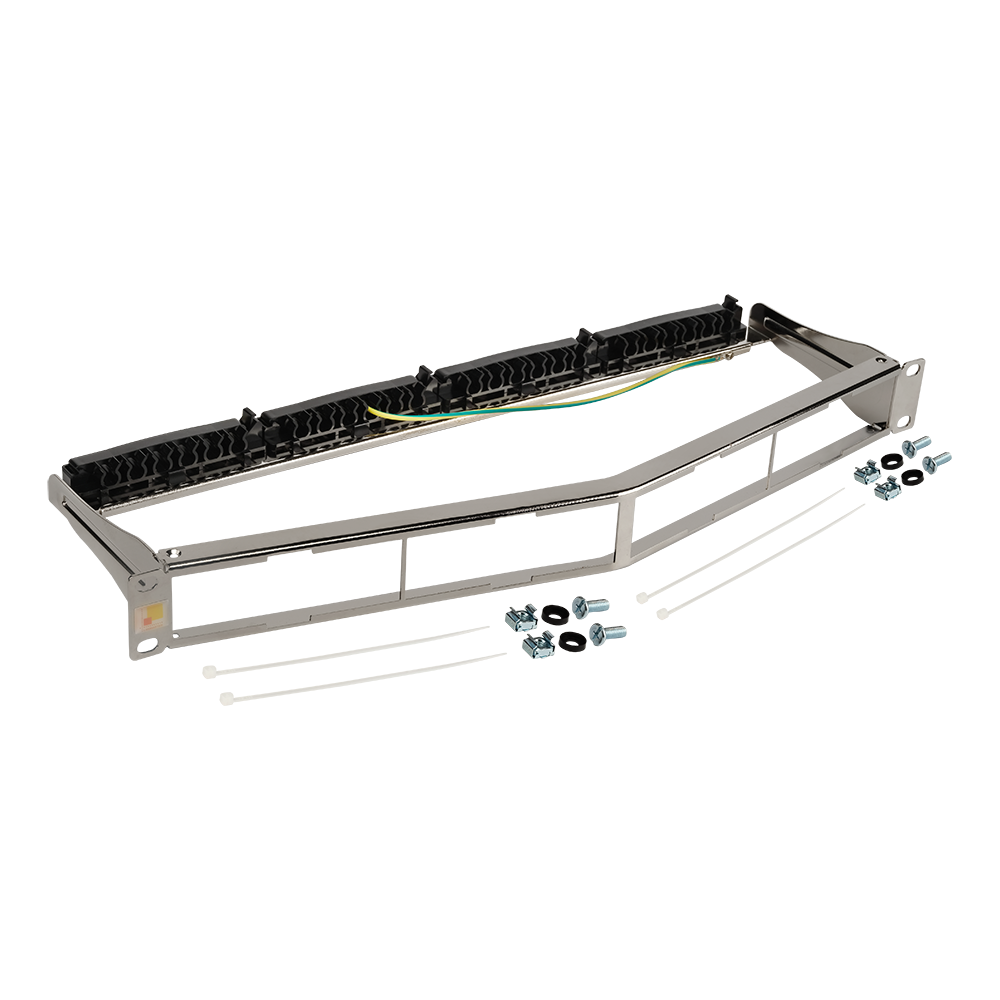 Коммутационная патч-панель предназначена для разделки на ней кабелей различных подсистем СКС и подключения отдельных составляющих сети друг к другу коммутационными шнурами.Патч-панель высотой 1U имеет 4 слота под установку специальных лицевых вставок (см. совместимые товары). Модульная панель удобна при монтаже, а также позволяет увеличить скорость работы. Лицевые вставки легко фиксируются в отверстиях при помощи защелок.Благодаря модульной конструкции, можно сочетать блоки из разных модулей в рамках одной панели. Угловая конструкция панели позволяет обеспечивать корректный радиус изгиба патч-кордов, подключаемых к патч-панели. Вследствие чего использование таких патч-панелей рекомендовано при организации горизонтальной и магистральной подсистем СКС.Угловые патч-панели позволяют отказаться от промежуточных горизонтальных органайзеров и максимально эффективно использовать свободное пространство в шкафу.Для удобства монтажа и дополнительной фиксации кабеля в комплектацию панели добавлена поддерживающая скоба. На скобе предусмотрены специальные пластиковые фиксаторы кабеля. Гребенка имеет специальные ложементы, которые позволяют фиксировать кабели различного диаметра без использования обычных нейлоновых стяжек.Использование скобы обеспечивает требуемый радиус изгиба и надежную фиксацию кабелей в процессе терминации и последующей эксплуатации.