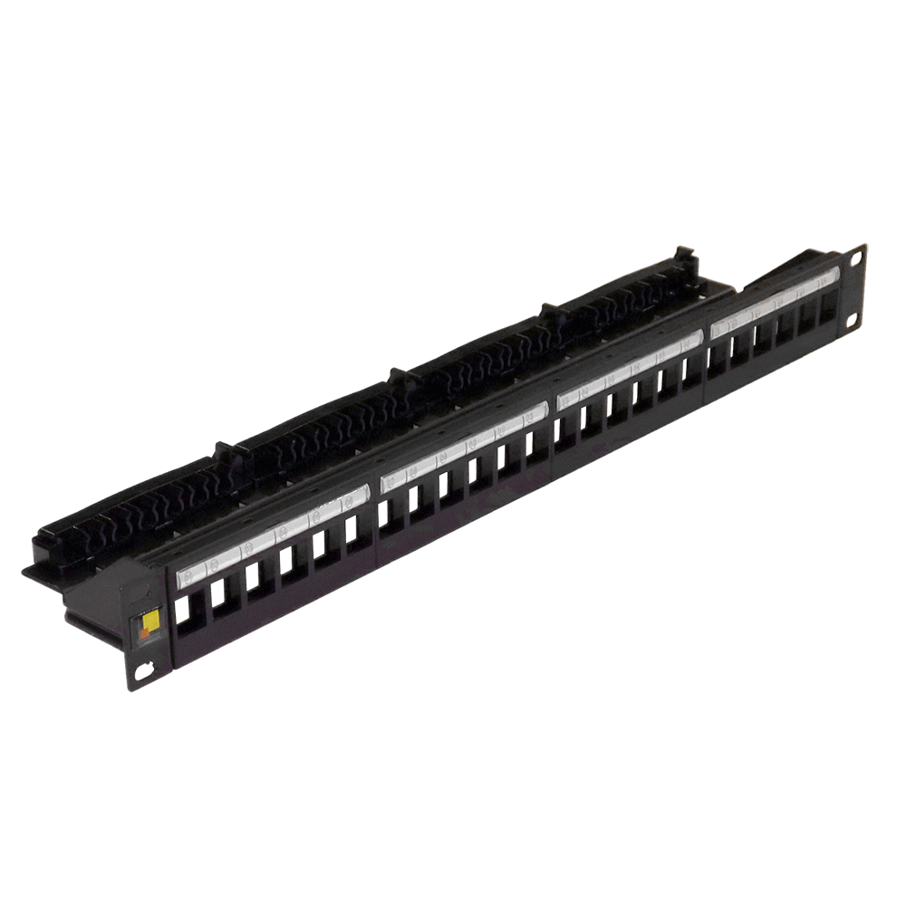 Наборная патч-панель предназначена для установки UTP модулей типа Keystone или Tooless Keystone (см. совместимые товары).В комплект поставки входят:Патч-панель - 1 шт.Скоба для крепления кабеля - 1 шт.Крепеж для установки на направляющие- 1 шт.Стяжки для кабеля - 4 шт.Каркас панели и задняя скоба изготовлены из холоднокатаной стали, окраска-порошковое напыление. На лицевой части декоративная несъемная накладка из пластика. С лицевой стороны порты панели имеют площадки с вкладышем под цифровую маркировку.Для удобства монтажа и дополнительной фиксации кабеля, панели поставляются в комплекте со скобой для закрепления кабеля, подводимого с задней стороны панели.На скобе предусмотрены специальные пластиковые фиксаторы кабеля. Гребенка имеет специальные ложементы, которые позволяют фиксировать кабели различного диаметра без использования обычных нейлоновых стяжек.Использование скобы обеспечивает требуемый радиус изгиба и надежную фиксацию кабелей в процессе терминации и последующей эксплуатации. Для организации мультимедийных кабельных систем возможно использование панели со следующими видами адаптеров типоразмера Keystone:BNC-адаптерыОптические адаптерыАудио-адаптерыВидео-адаптерыВнимание!Корпус панели LAN-PPN24OK-UTP в 2024 году претерпел некоторые изменения во внешнем виде. На складах у дистрибьюторов могут храниться патч-панели как новой, так и предыдущей версии корпуса. В старом корпусе доступно только то количество товара, которое имеется на данный момент на складах дистрибьюторов.