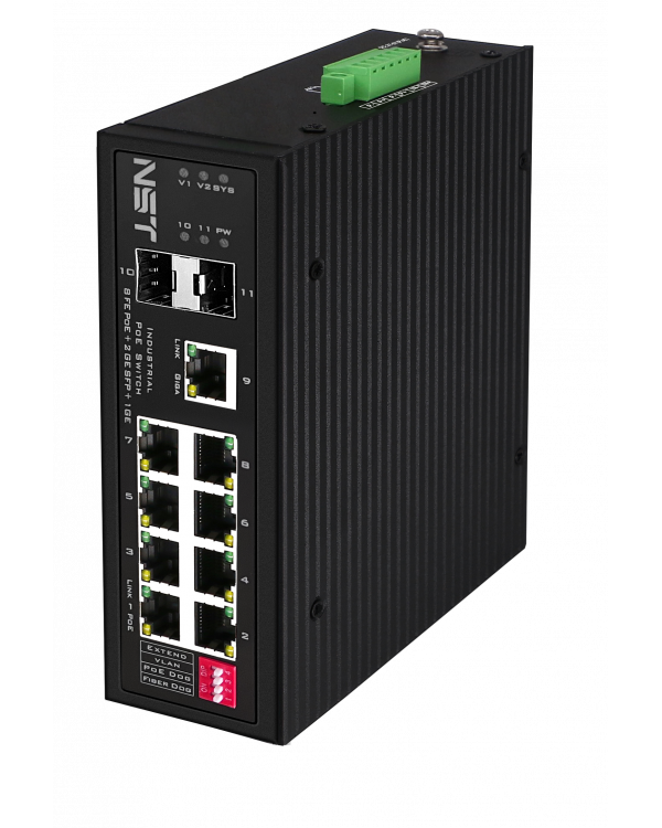 PoE коммутатор Fast Ethernet на 8 FE RJ45 PoE + 1 x GE RJ45 + 2 GE SFP порта. Порты: 8x10/100Base-T, 1x10/100/1000Base-T, 2x1000Base-X. Порты PoE: 1-2 - до 90W (IEEE 802.3af/at/bt),3-8 - до 30W (IEEE 802.3af/at). Автоматическое определение PoE устройств. Суммарная мощность PoE до 360W. Поддержка режима CCTV: Увеличение расстояния передачи данных и питания до 250 м. Встроенная грозозащита 6kV на порт, электростатическая защита 8кВ. Питание: 2 x входа DC37-57V(370W).БП в комплект НЕ входит. Монтаж на DIN-рейку или на стену (крепление в комплекте). Рабочая температура: -40…+80°С ШхВxГ 0.187 x 0.130 x 0.050 м. Вес устр-ва, кг: 1.35
