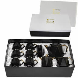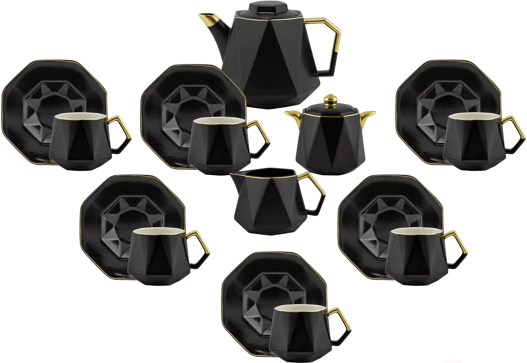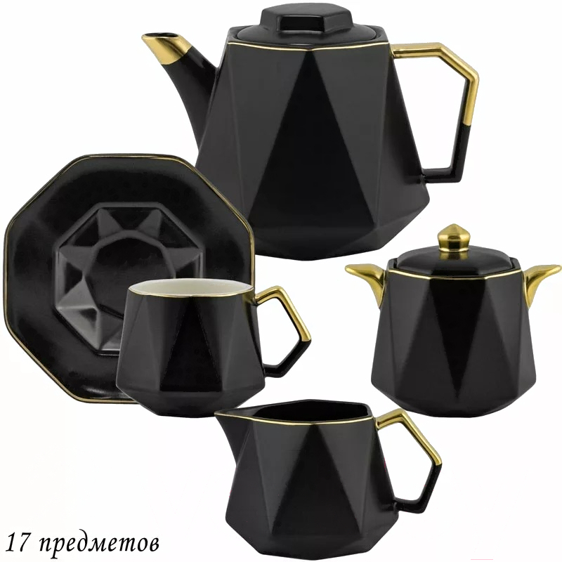 - В наборе блюдце (6 шт.), чайник, чашка (6 шт.), молочник, сахарница