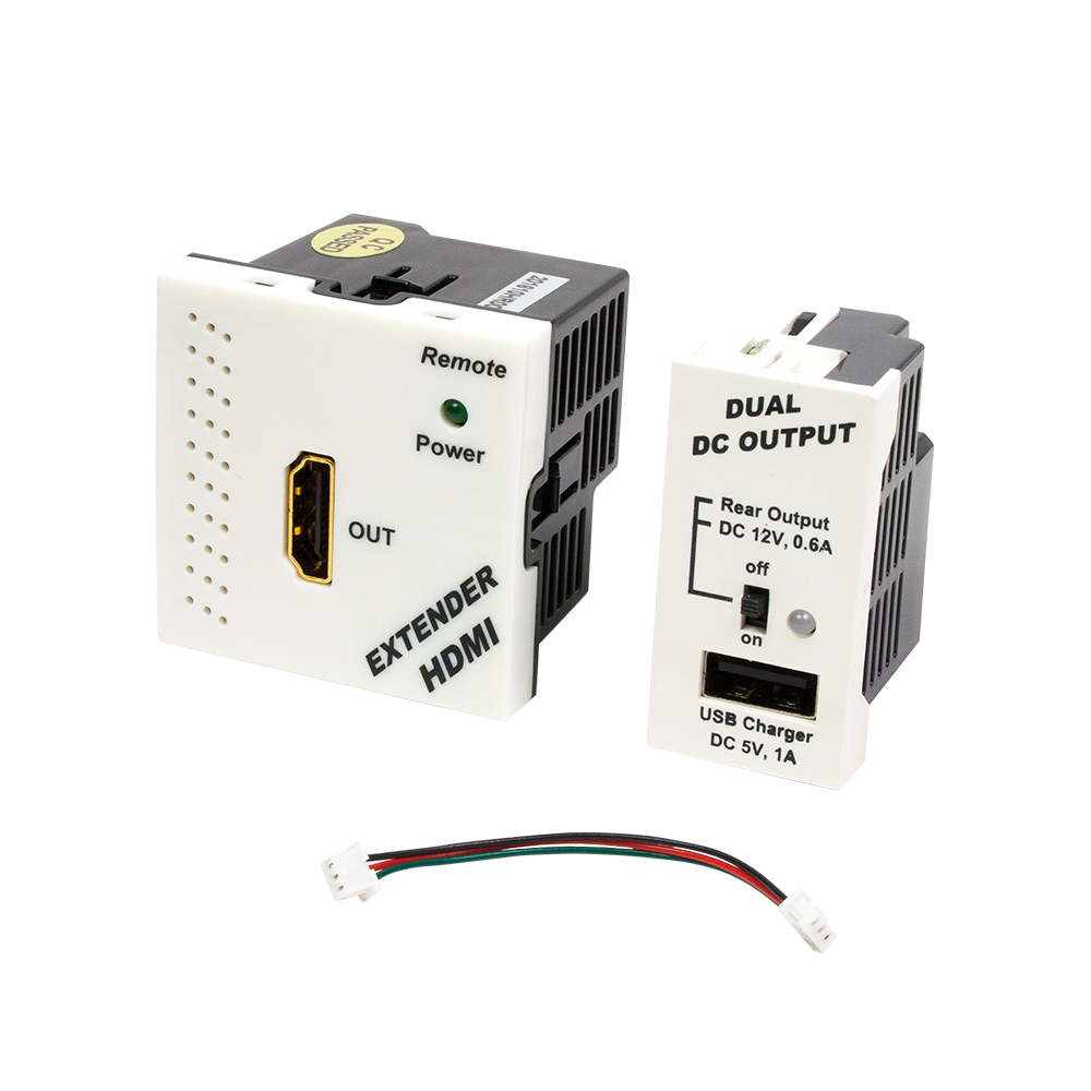 Вставки с преобразователями интерфейсов RJ45-HDMI позволяют передавать видео-сигнал по имеющейся кабельной сети на расстояние до 50 метров по двум витопарным кабелям категории 5e.Вставка имеет размер 45х45 мм под французский стандарт Mosaic Каждая вставка идет в комплекте с блоком питания с функцией USB-зарядки, имеющим размер 22.5x45 мм.