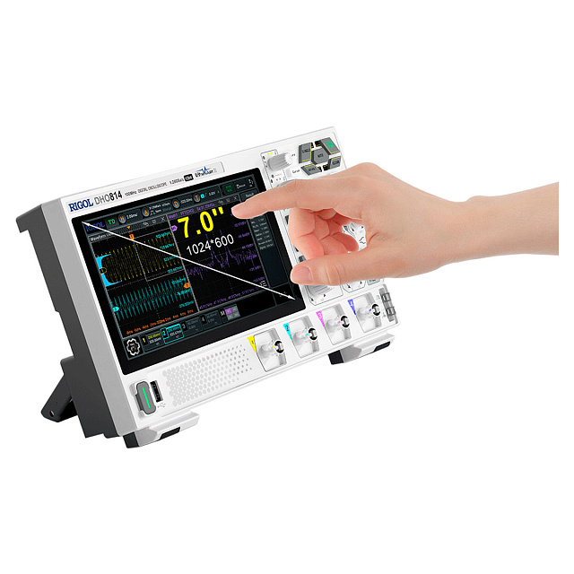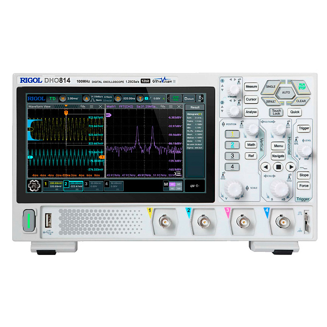 Цифровой осциллограф RIGOL DHO814 – компактный прибор с 7-дюймовым сенсорным дисплеем, который отличается от других лабораторных устройств своего ценового диапазона улучшенными характеристиками и расширенной функциональностью. Он оснащен четырьмя аналоговыми каналами с полосой пропускания 100 МГц и обеспечивает 12-битное разрешение по вертикали при максимальной частоте дискретизации 1,25 Гвыб/с на один канал и при скорости захвата до 1 000 000 осциллограмм/с, обеспечивая возможность визуального исследования динамичных сигналов сложной формы при решении широкого круга задач. Расширенный набор интерфейсов позволяет легко интегрировать изделие в состав измерительных систем и автоматизированных установок, обеспечивая совместное функционирование с другим лабораторным и компьютерным оборудованием.