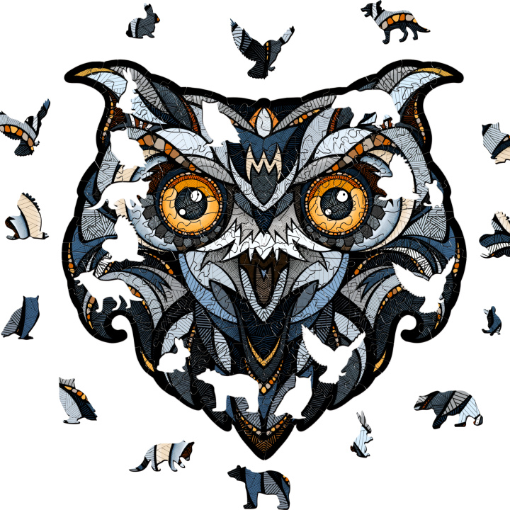 Этот пазл сочетает головоломку и искусство: собирая детали-животные, вы создаете изысканное изображение филина. Готовую работу можно оформить как настенное панно. Идеален для семейных вечеров и творческого отдыха.
