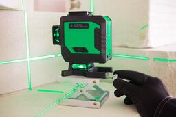 Удобная разметка. Уровень проецирует три линии: одну горизонтальную и две вертикальных. Все линии имеют развертку 360°. Луч для разметки будет видно в любой точке. При включении вертикальных линий получается перекрещивающиеся под прямым углом проекции. Очень удобно при выравнивании стен и углов между стенами. Лазерные линии можно поочередно отключать оставляя только необходимую для работы. Зеленый лазерный луч гораздо лучше видно чем красный при одинаковых условиях.