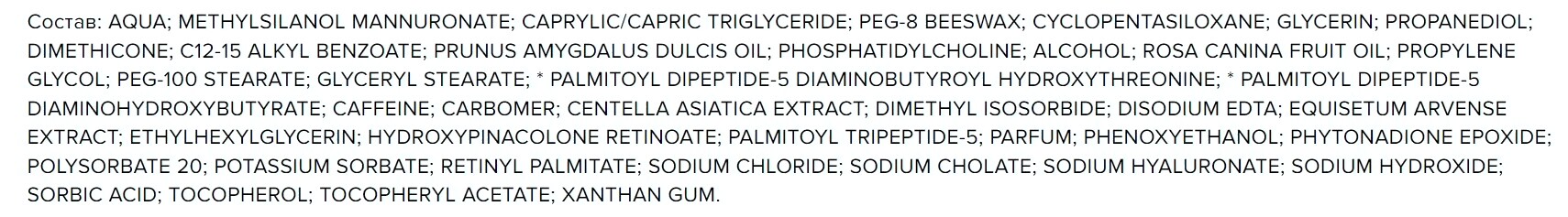 - Активные ингредиенты ретинол, кремний, пептиды, гиалуроновая кислота, экстракт хвоща, витамин Е, экстракт центеллы, масло шиповника, масло миндаля, кофеин, витамин K