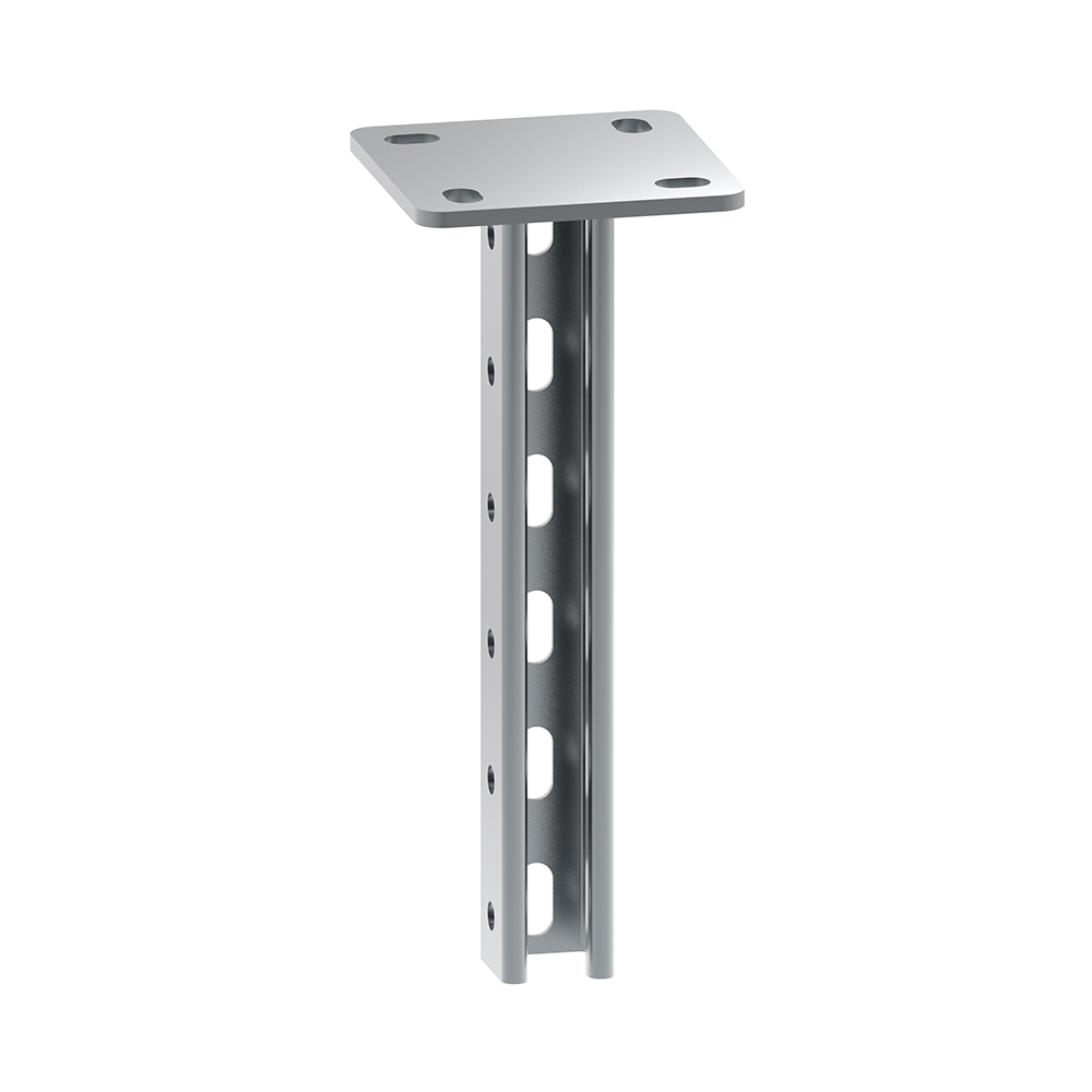 STRUT-системы в исполнении HDZ - это изделия с защитным покрытием горячий цинк (по ГОСТ 9.307), которые предназначены для создания инженерных систем с высокой несущей способностью любой сложности из профилей, монтажных элементов и специализированных болтовых соединений как внутри помещений, так и на открытом воздухе. Страт-стойка используется для потолочного или напольного крепления кабельной трассы. Элемент выполнен из С-образного профиля и опорной пластины с отверстиями для крепежа. Перфорация обеспечивает удобный монтаж консолей или кабельных полок на любой высоте.