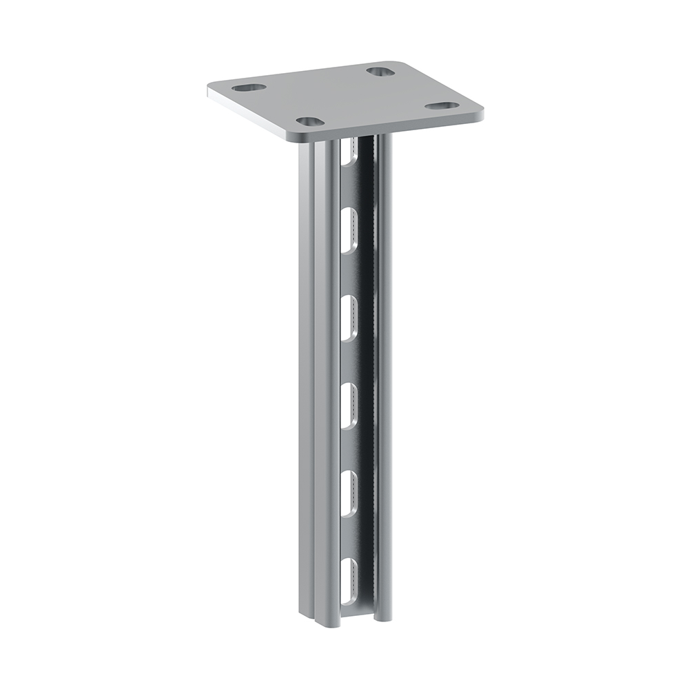 Страт-стойка используется для потолочного или напольного крепления кабельной трассы. Элемент выполнен из С-образного профиля и опорной пластины с отверстиями для крепежа. Перфорация обеспечивает удобный монтаж консолей или кабельных полок на любой высоте. Изделие выполнено из оцинкованной стали.