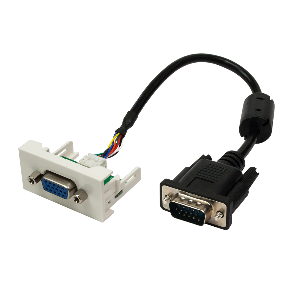 Лицевая панель предназначена для организации точек подключения мониторов или проекторов с разъемами VGA/SVGA D-Sub. С лицевой стороны модуль оснащен разъемом D-SUB (HDB-15) мама. С тыльной стороны панели находится удлинительный кабель длиной 20 см или 3 м. Кабель оконцован разъемом D-SUB (HDB-15) папа, обеспечивает удобное подключение VGA-кабелей,подходящих с внутренней стороны розетки.